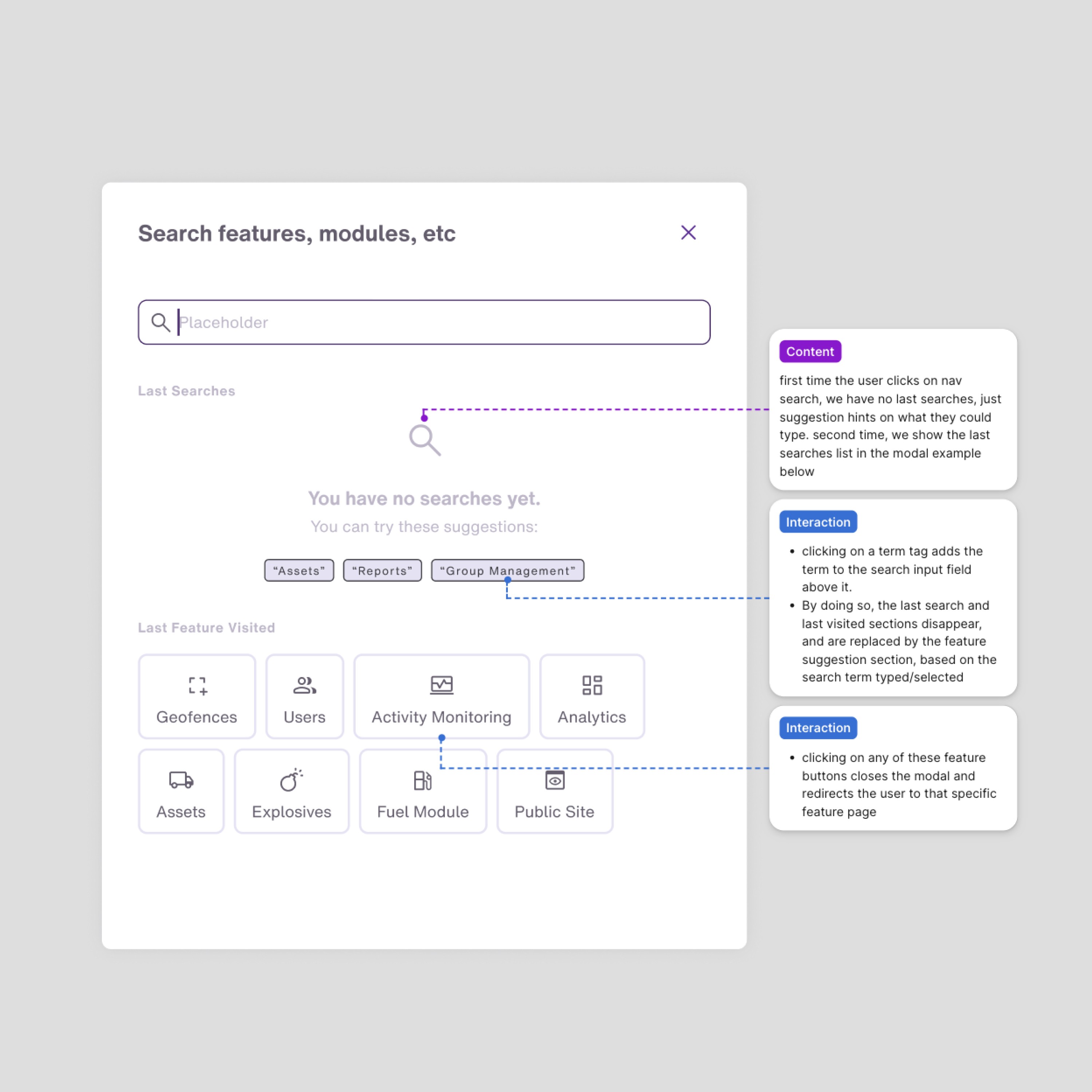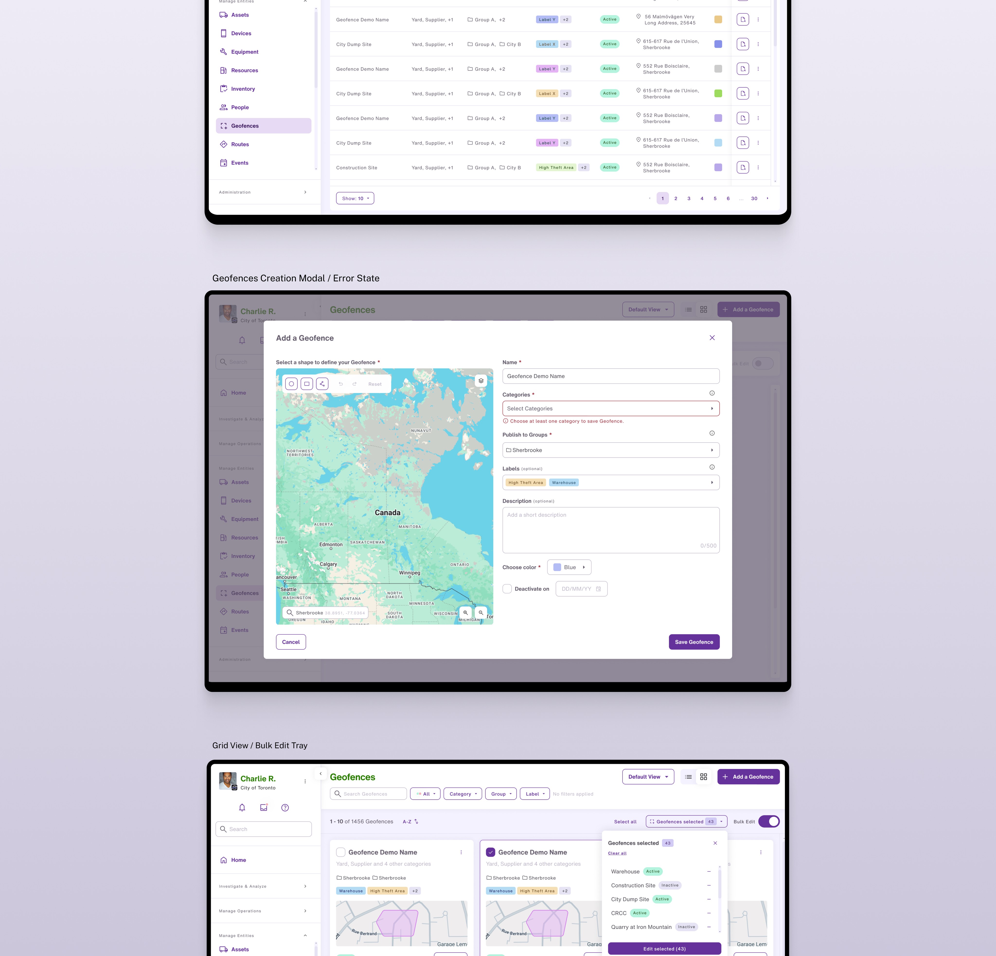 One of my responsibilities was the flow of Geofence Creation & Management, a critical feature for the MVP. A geofence is a virtual boundary drawn around a real-world geographic area. This feature is used by the core user group, Operational Fleet Supervisors, on a daily basis to track and analyse vehicle operations, e.g. to detect unauthorized vehicle movement outside approved zones.