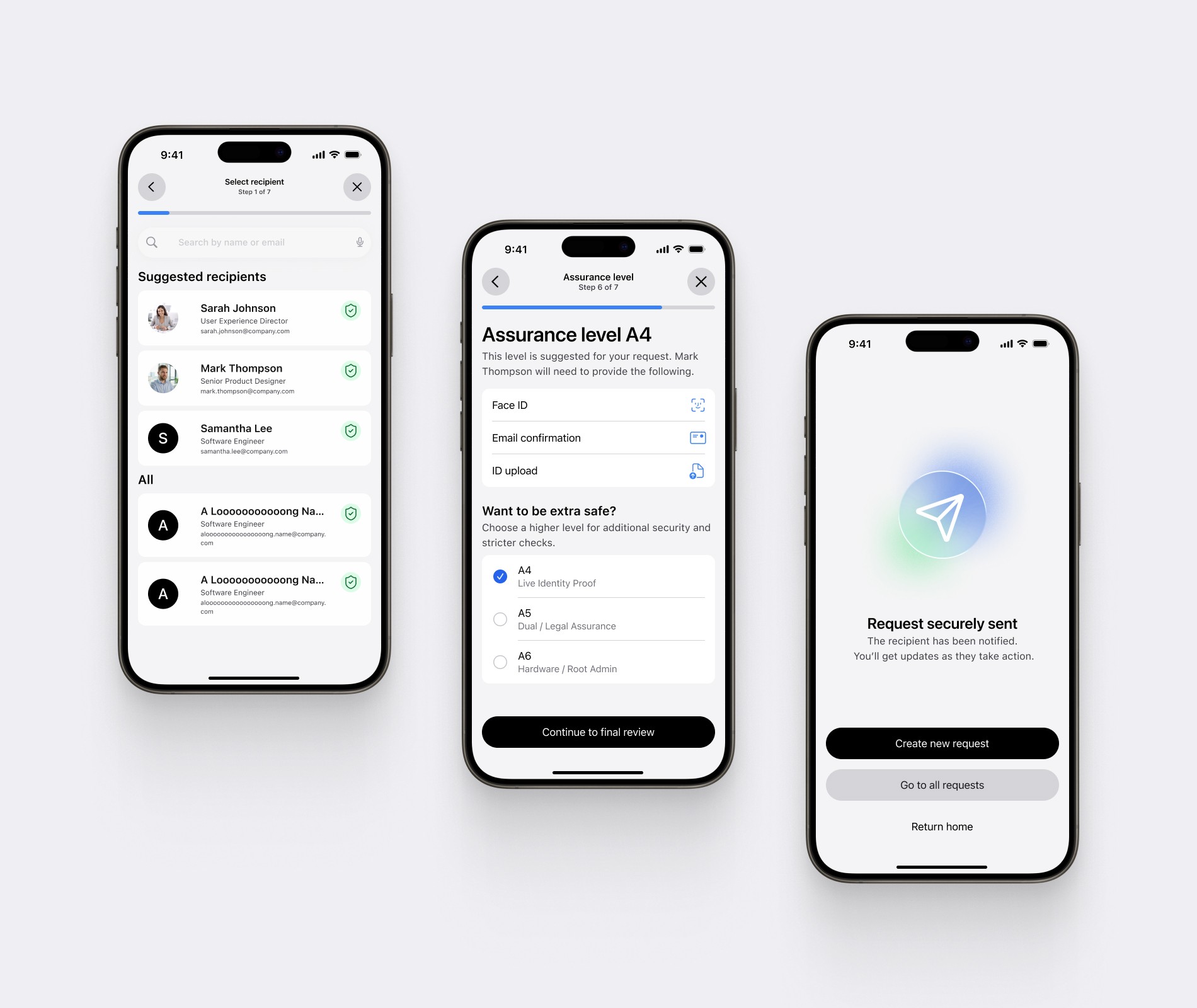With scope defined, we started designing three user flows: onboarding, sending a verification request, and receiving one.