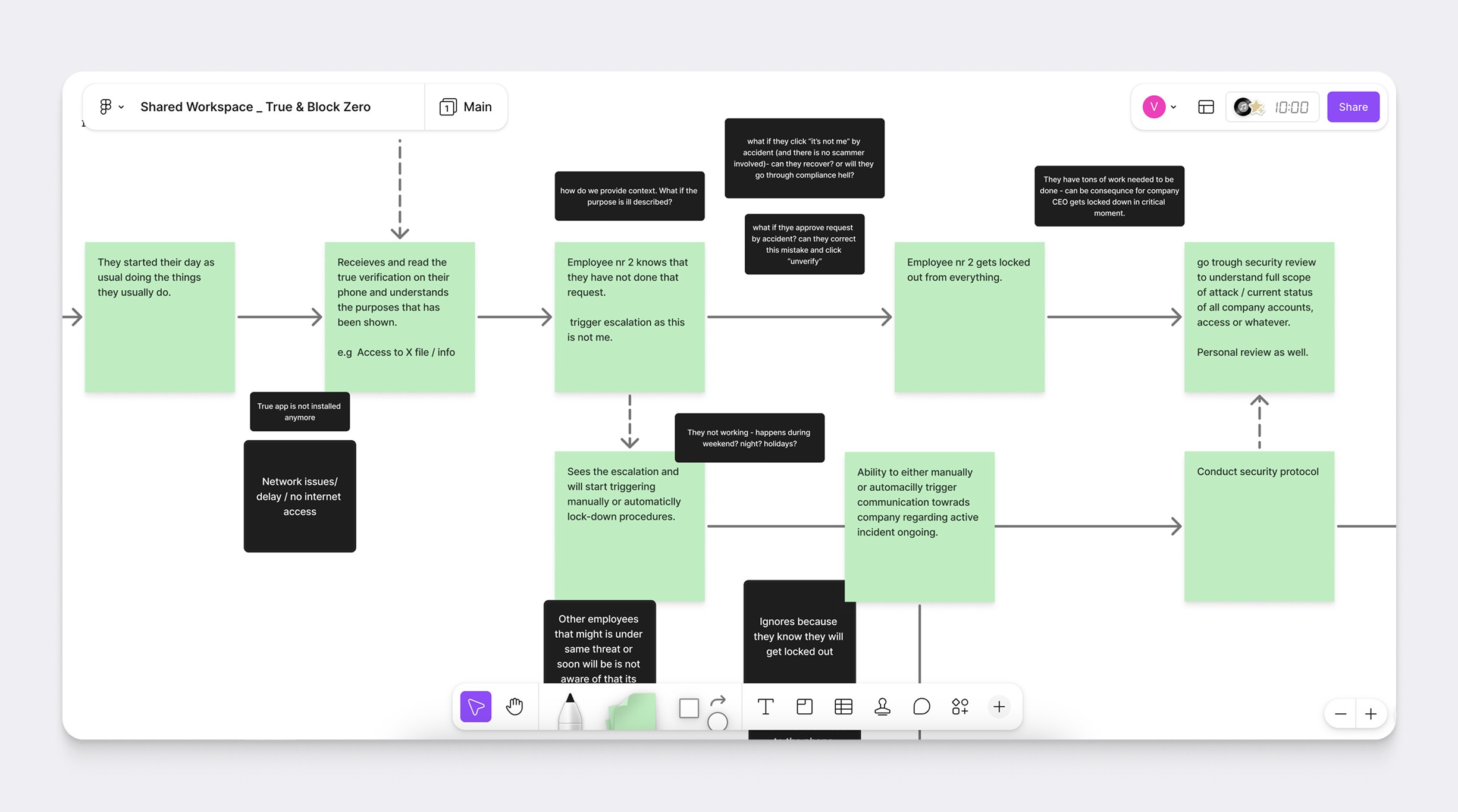 To address the gap, I organised a Discovery & Alignment workshop — mapping realistic scenarios and surfacing the UX nuances that weren't obvious from the idea alone. For example, what if a user receiving payment request denies by accident, should the sender's account necessarily be blocked right away? How much leeway does the UX provide for recovery in such security-intense contexts?